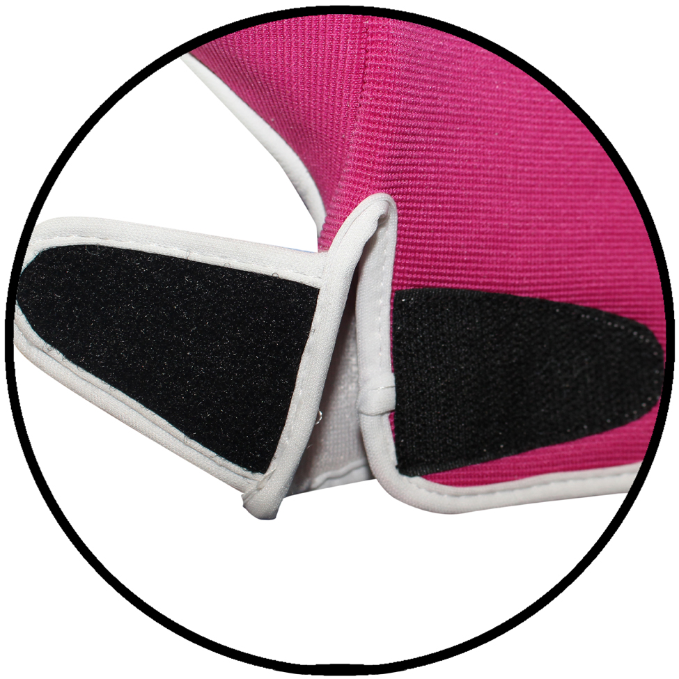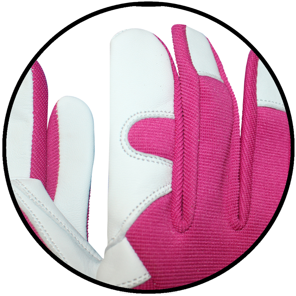 | FINE-1818 | Palm Kidskin very soft leather back pink stretchy spandex, velcro fastening, Wing thumb with reinforcement. |