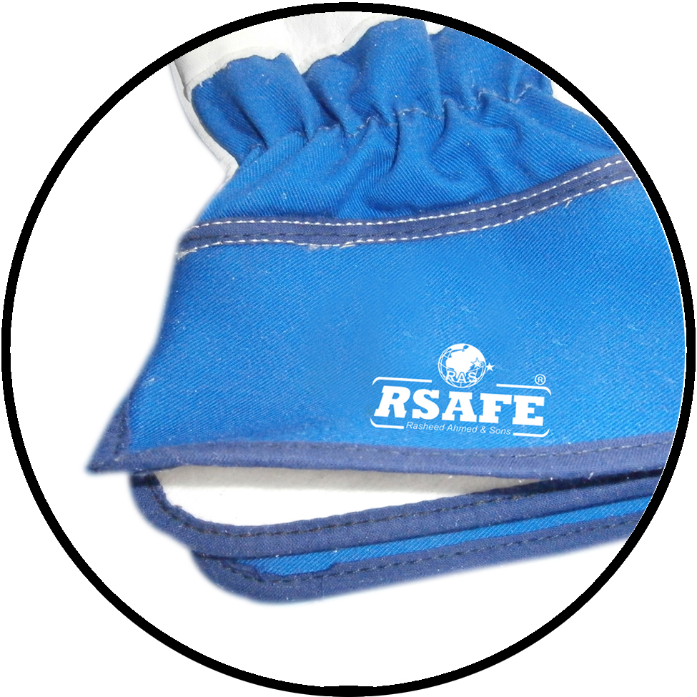 | FINE-1605FL | Palm Goatskin Leather back blue drill, wing thumb, Rubberized safety cuff, inside full fleece lined. |