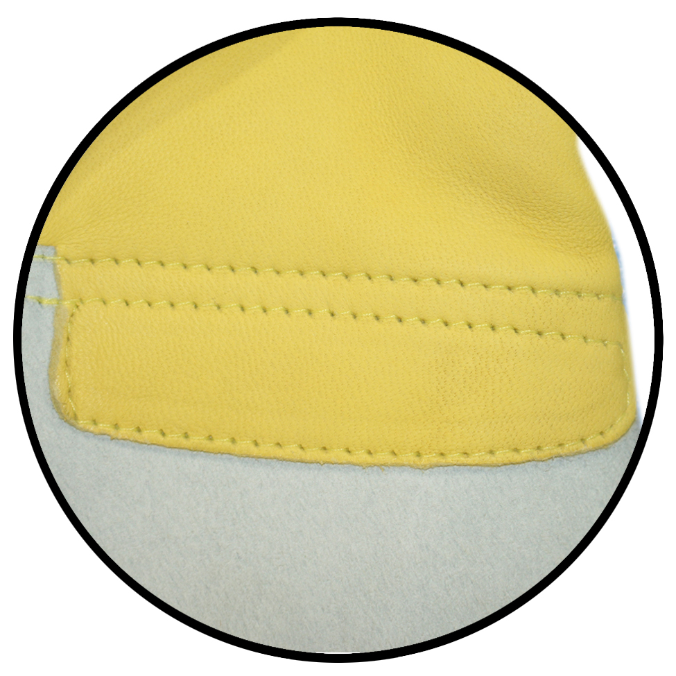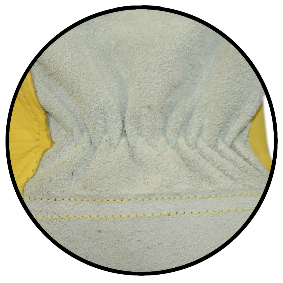 Palm Goatskin, back cow split leather is natural strongest leather, it has very high tensile strength and abrasion resistant, This is good strength our leather gloves and more durable, Rubberized Safety cuff for arm protection, Wing thumb for extra durability, inside, fully fleece lined with excellent softness and keep your hands warm in cold.