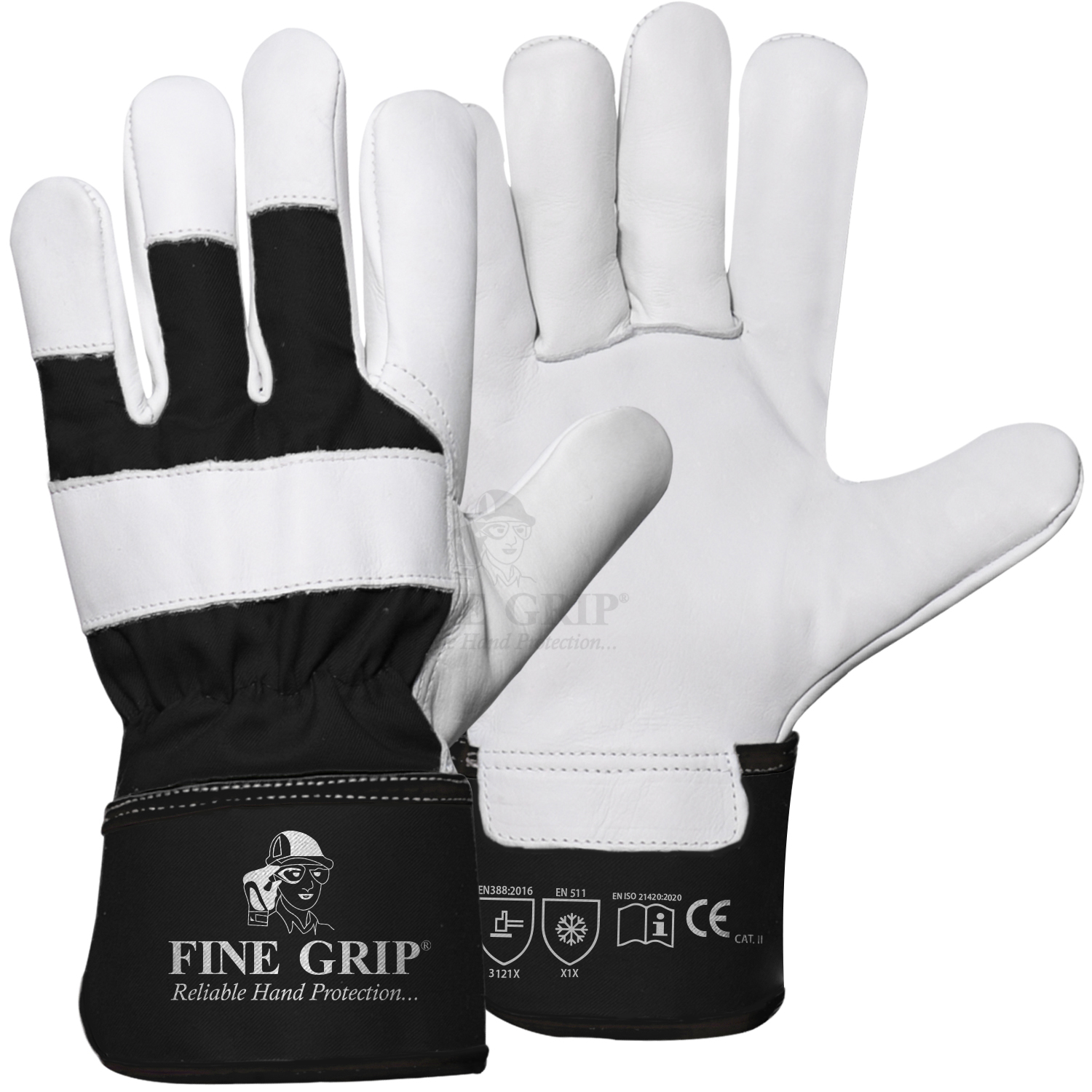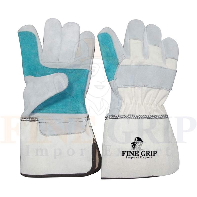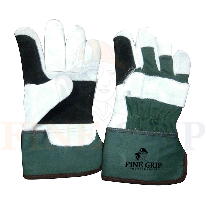 | RSAFE-1643 | Palm Cow Split Leather, back natural colour twill fabric, wing thumb, rubberized safety cuff, half lined. |