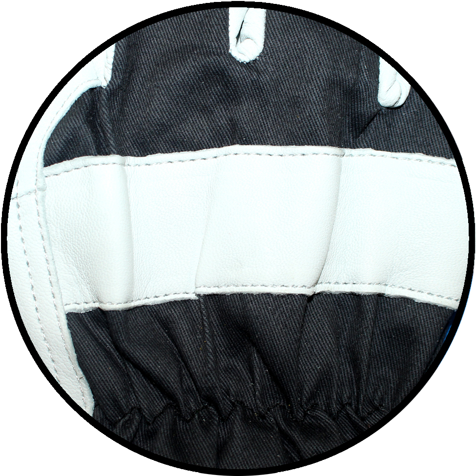 | FINE-1606 | Palm Goatskin leather back black drill, black rubberized safety cuff inside unlined lined, wing thumb. |