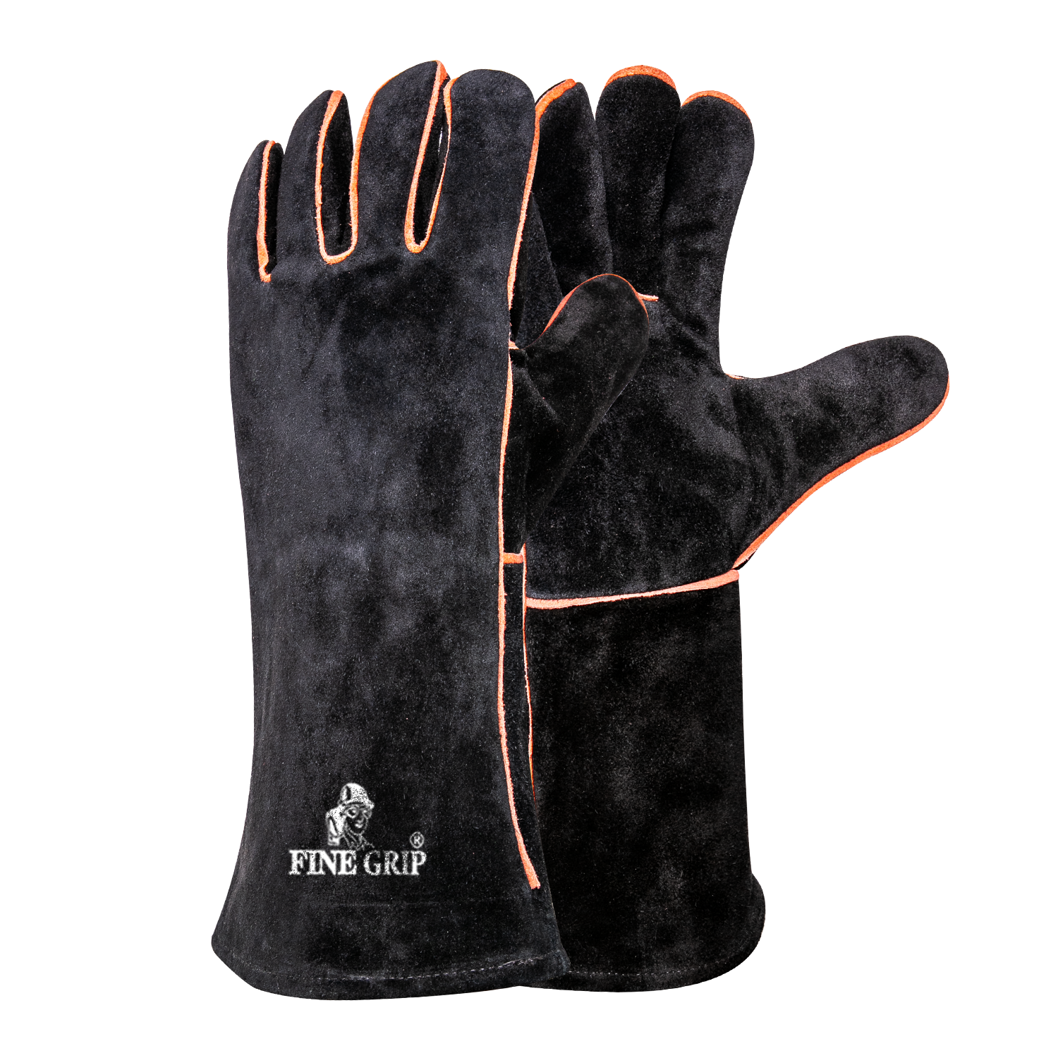 | FINE-984 | Red A Grade Cow Split Leather Welding Gloves, wing thumb, inside Full Lined, Natural color welted sewn with Kevlar threads. |